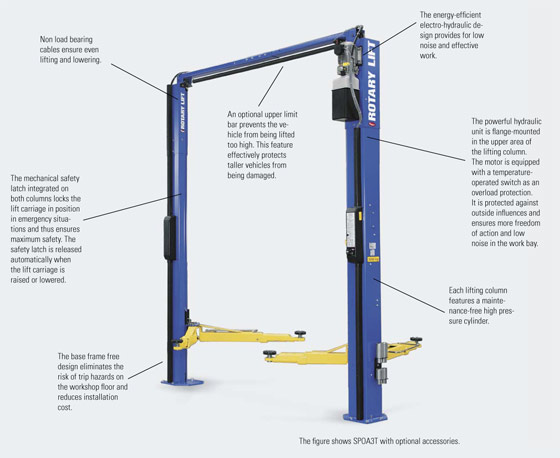 The new SPOA3T 2-post lifts offer maximum drive through clearance with minimum external dimensions. The asymmetrical design of the posts and supporting arms also provides a spacious pick-up area - the lift can be entered from either side.